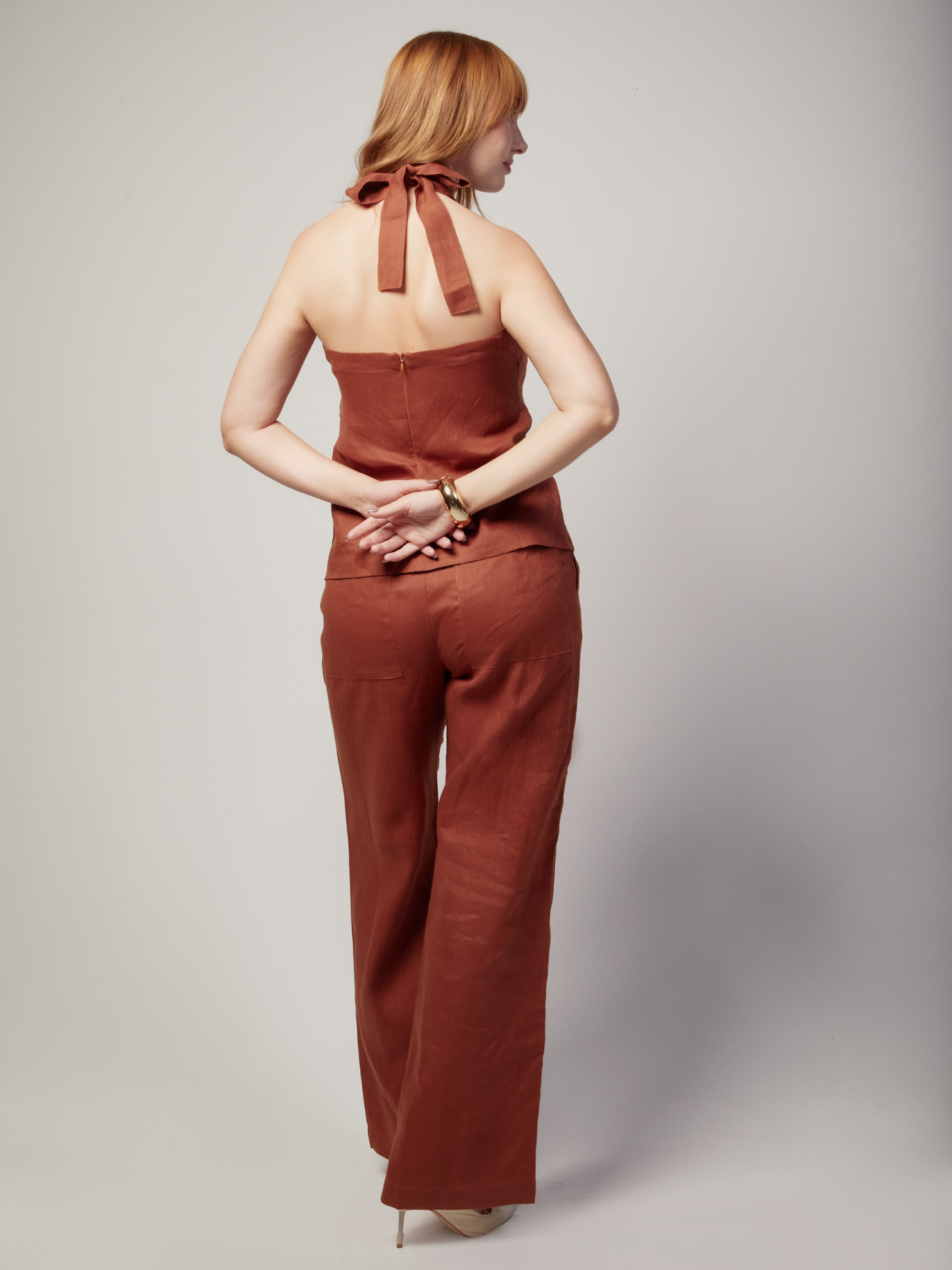 Calça em construção alfaiataria, em linho puro (100% linho). Bolsos laterais embutidos e dois bolsos traseiros grandes. Prega na parte da frente da calça e passantes. O abotoamento por zíper e colchetes conferem um ar mais refinado e limpo à peça. Modelagem da calça é mais reta porém ampla, estilo pantalona. Forma o conjunto perfeito com nosso top Amanda feito no mesmo tecido e cores.