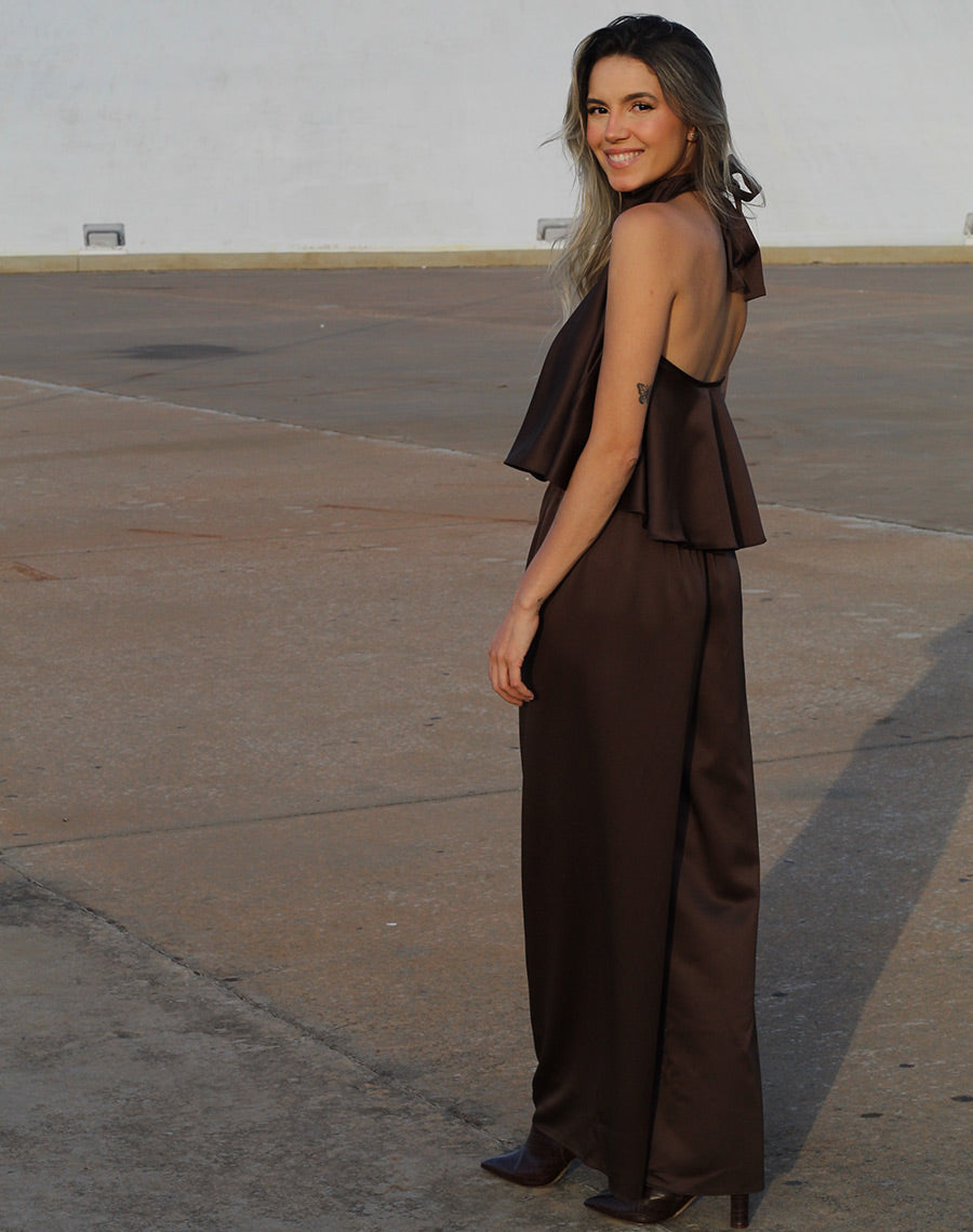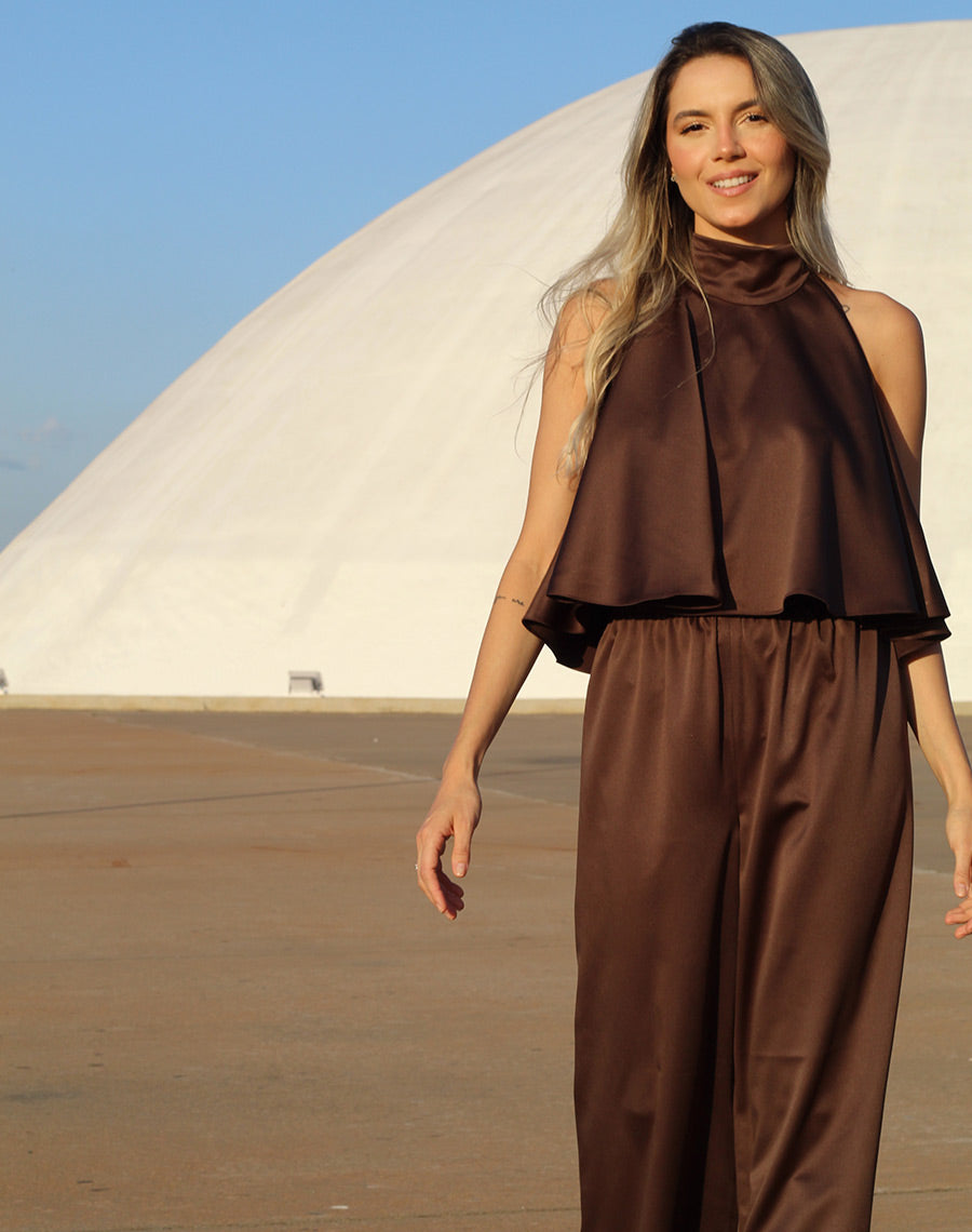 Confeccionada em crepe acetinado, a calça no estilo pijama, pantalona e cintura ajustada por elástico. Aliás, é preciso ressaltar esse elástico, devidamente reforçado para aquela sustentação (e compressão) que precisamos. Pode ficar tranquila que ele, com certeza, não vai perder a elasticidade com o uso. Além disso, o cós tem costuras rebatidas, de reforço e que impedem que o elástico fique “dobrando” e incomodando, sabe?