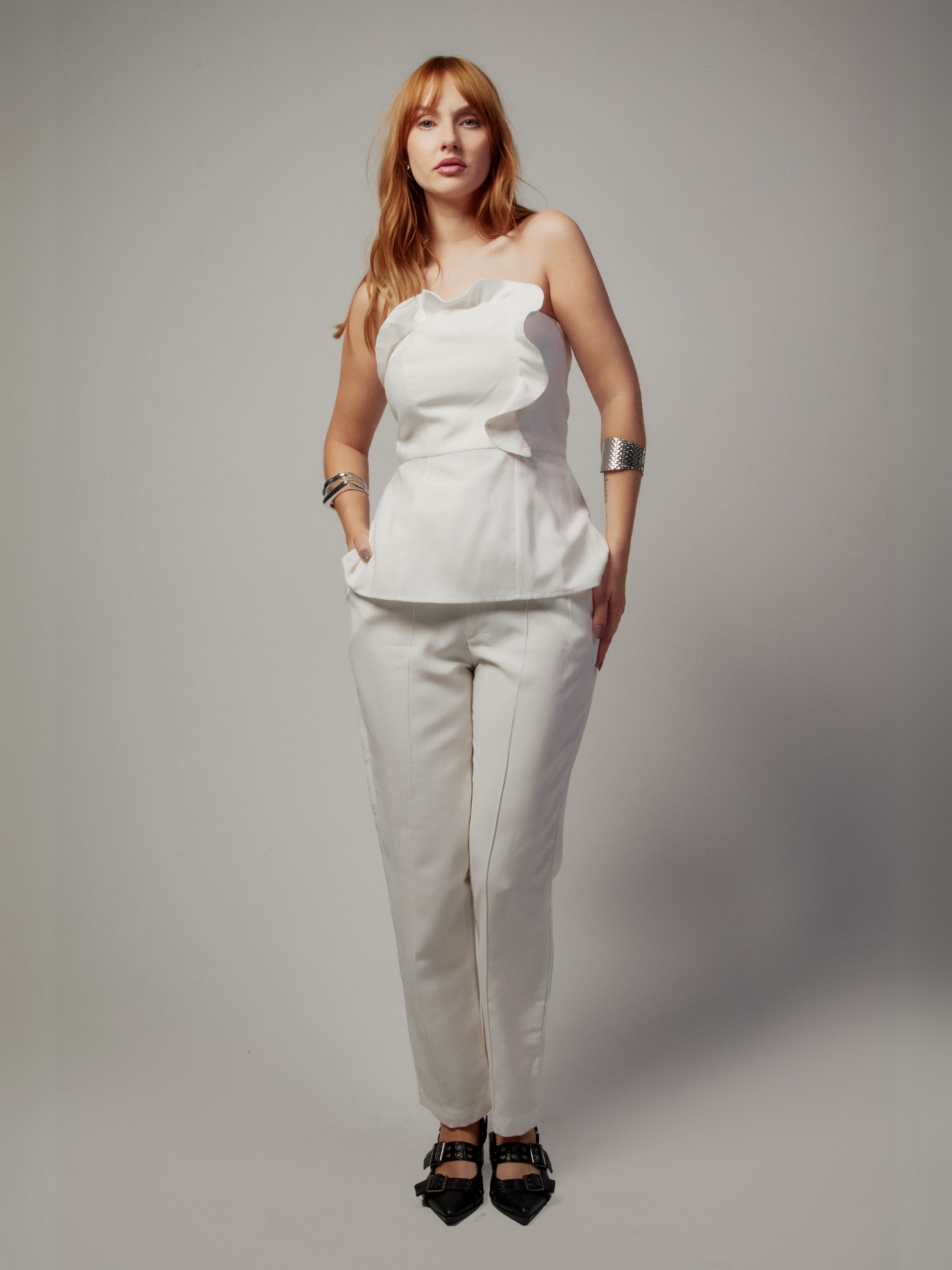 Calça reta, cintura alta, confeccionada em tecido que mistura o toque fresco e macio da viscose, com a estrutura e durabilidade do poliéster. De modelagem impecável, essa cala vai se tornar seu uniforme. Fechamento por zíper frontal e dois botões encapados, além de dois bolsos faca frontal e dois bolsos traseiros oversized. O toque final é a linha vertical vincada na costura, perfeita para alongar a silhueta visualmente. Maravilhosa em todos os detalhes.