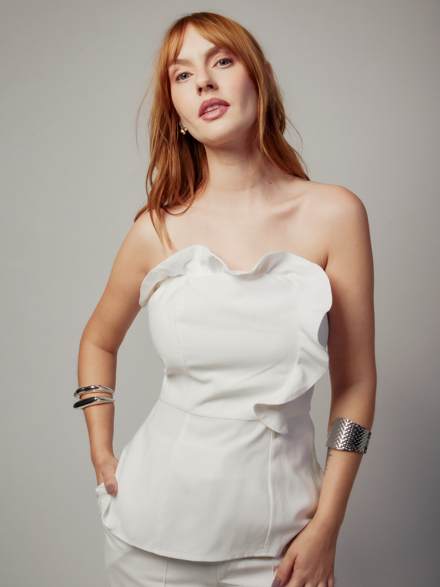 Top sem alças, com babado godê no acabamento. Essa peça é o match perfeito com nossa Calça Vivian. Levemente peplum e mais alongado, essa peça pode usada tanto por fora dou por dentro de calças, shorts e saias: ela realmente não faz volume. A sustentação é reforçada com o elástico na parte superior do top e fechamento por zíper destacável na parte das costas, finalizado por uma fenda.