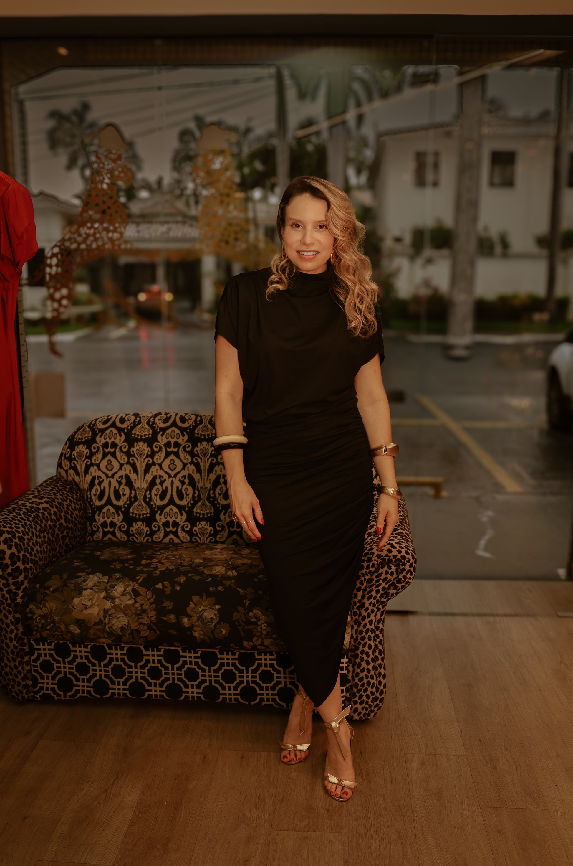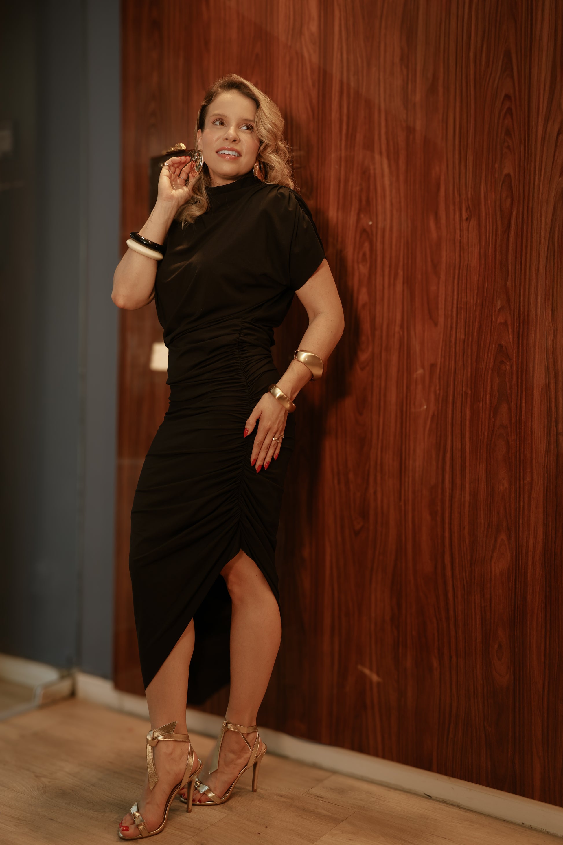 O drapeado estratégico ao longo do corpo cria textura e sofisticação, enquanto o decote mais fechado equilibra sensualidade e elegância. A fenda discreta adiciona leveza ao caminhar, tornando o vestido ideal para ocasiões especiais, eventos noturnos ou produções elegantes do dia à noite.